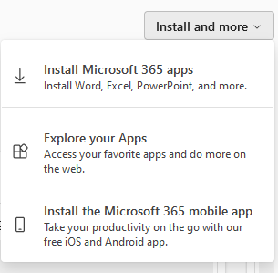 - In the top right corner you will see "Install and more". Click it then click "Install Microsoft 365 apps".